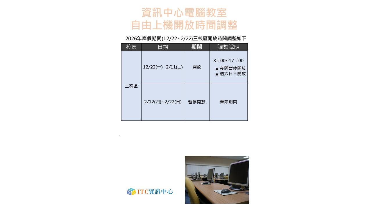 2026-01-06【資訊中心公告】2026寒假期間三校區自由上機教室開放時間調整